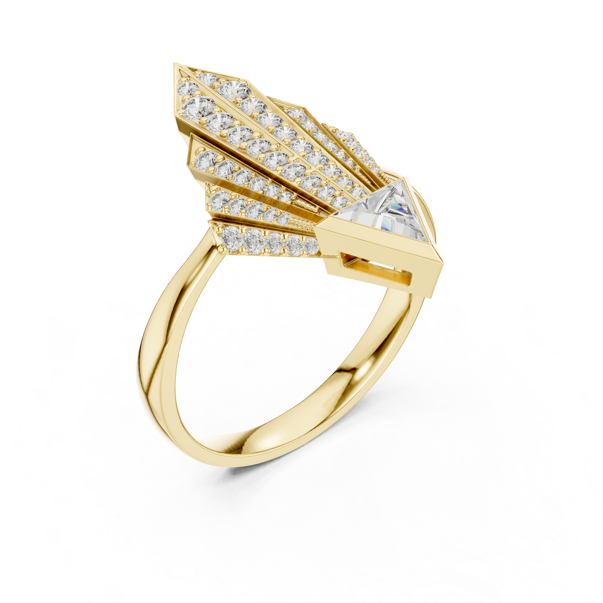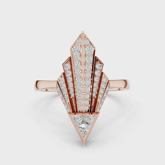 This bold geometric statement features a trillion-cut moissanite base, projecting upward into a tall, structured fan of brilliant pavé. The sharp, upward-sweeping design is fiercely modern.