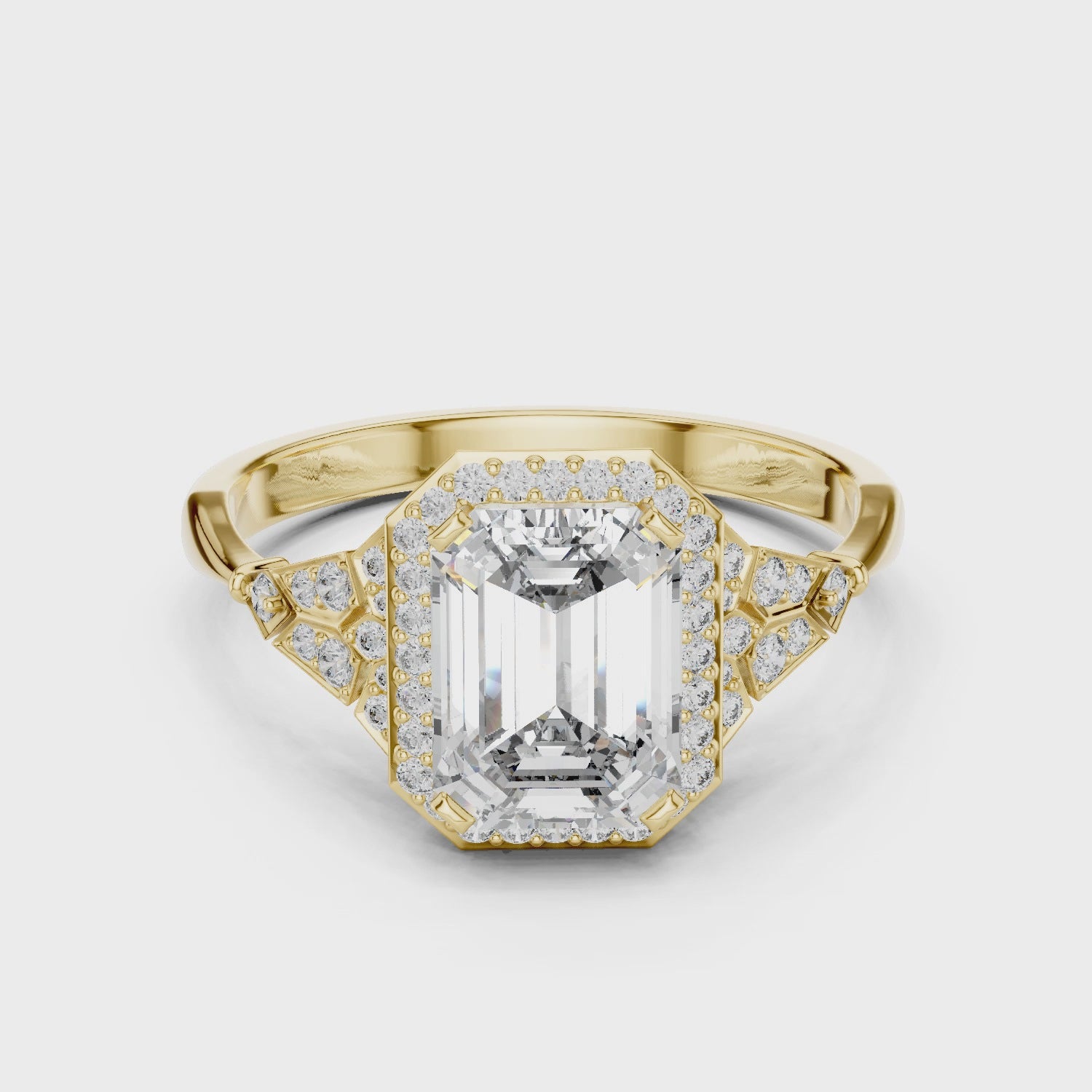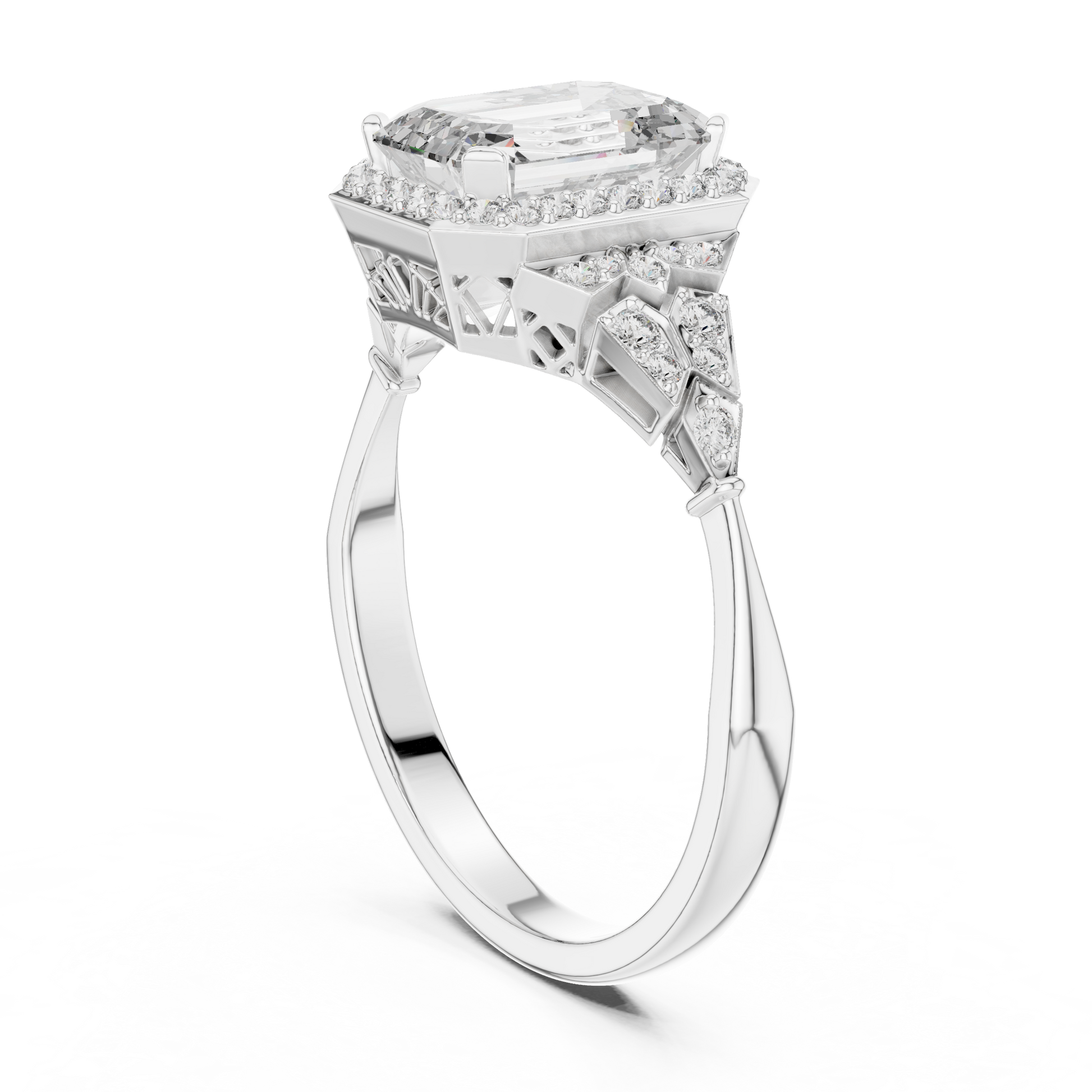 This vintage-inspired ring features an emerald-cut moissanite, supported by intricate, geometric pavé shield shoulders. The elaborate metalwork balances antique grandeur with refined, modern execution.