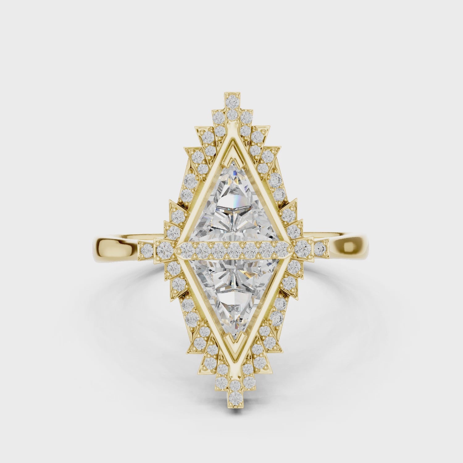This dramatic statement ring anchors a unique kite-shaped moissanite within an intricate, starburst-inspired halo. The jagged, geometric pavé setting catches light from every angle, creating an explosive silhouette.