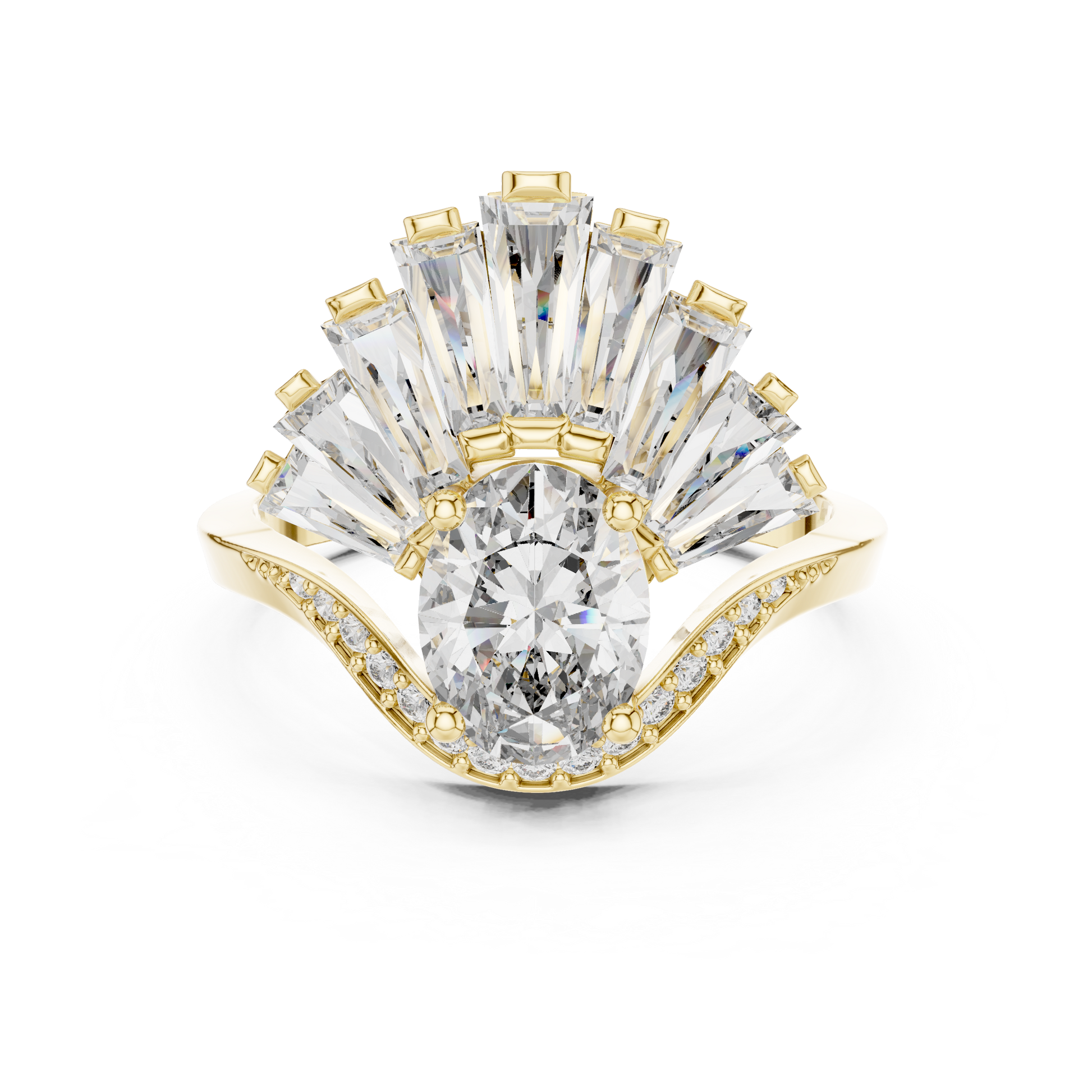 This majestic statement piece rests a brilliant oval moissanite within a sweeping pavé band, crowned by a dramatic, flared fan of step-cut baguettes. The majestic silhouette is an absolute triumph of form.